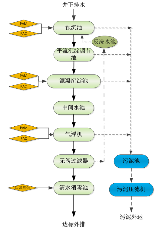 工 藝:預(yù)沉池+平流沉淀調(diào)節(jié)池+混凝沉淀池+中間水池+無閥過濾器+清水消毒池